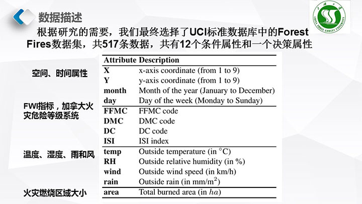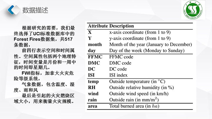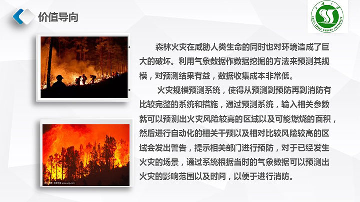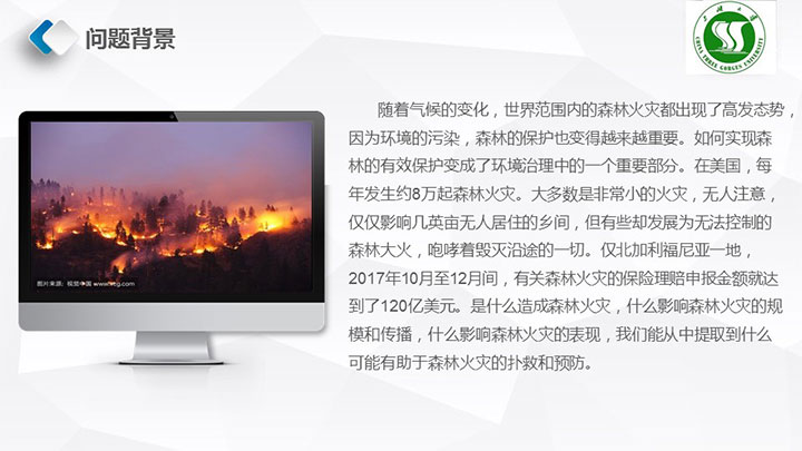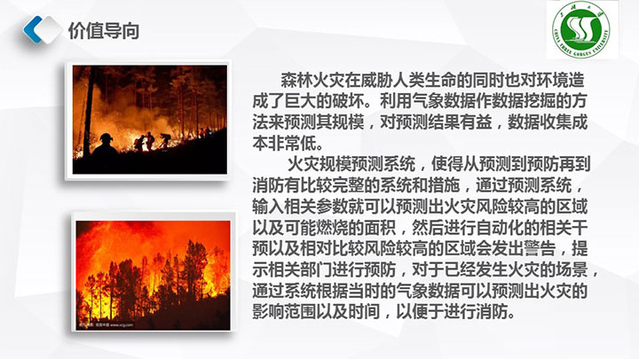 當今時代,隨著氣候的變化,世界范圍內的森林火災都出現了高發態勢,什么因素可以影響森林火災的規模和傳播并影響森林火災的表現,其發生有何規律,為了探究解決這些問題,該組選手考慮用大數據方法進行相關分析預測,通過當地氣象站以及自動氣象站等獲得的氣象數據、森林火災的規模等數據,用算法研究出的火災解決方案,來預測森林火災的燃燒面積,使用空間、時間系統和氣象數據進行選擇設置來預測火災的燃燒區域。