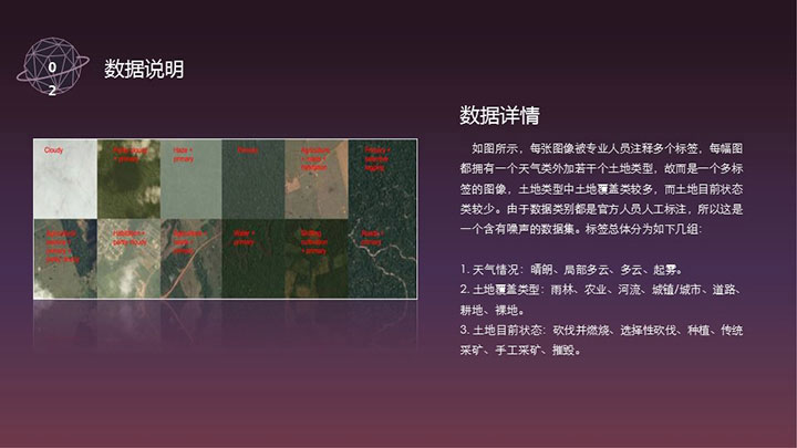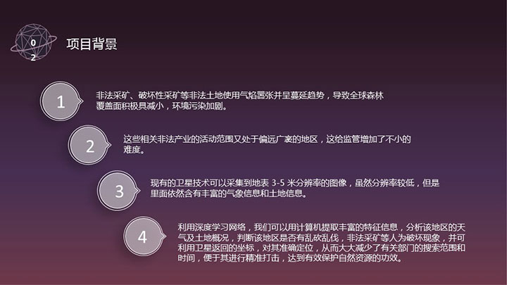 由于非法采礦、亂砍亂伐等破壞性開采自然資源的行為往往發生在偏僻的地方,有關部門在技術與資金的限制下不能進行很好的監管,致使其行為日益猖獗,自然環境各要素內在的配置機制發生失調,環境質量迅速惡化。面對此類現象,該團隊利用深度學習算法,通過分析衛星圖像中蘊含的氣候和土地信息,得到對應地區的土地使用情況,高效得尋找到疑似非法利用自然資源的地區,從而達到協助有關部門對土地監管的作用。